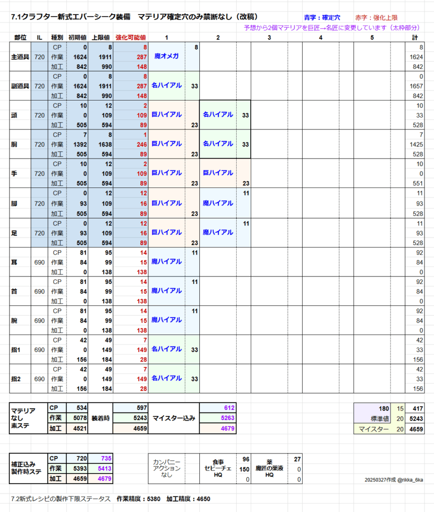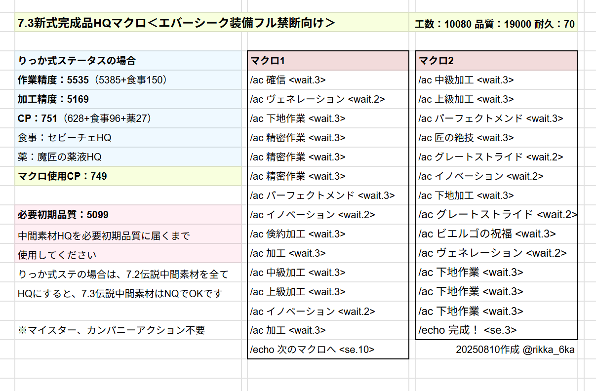 クラフターの7.1エバーシーク装備【フル禁断】を行った状態、【禁断なしほぼ下限ステ】向けのマクロを紹介しています。