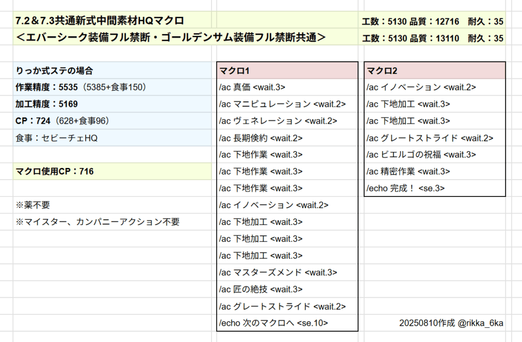 7.3新式のゴールデンサムの道具、ピーコック防具・アクセ、7.3新式食事をHQで作れるマクロです。