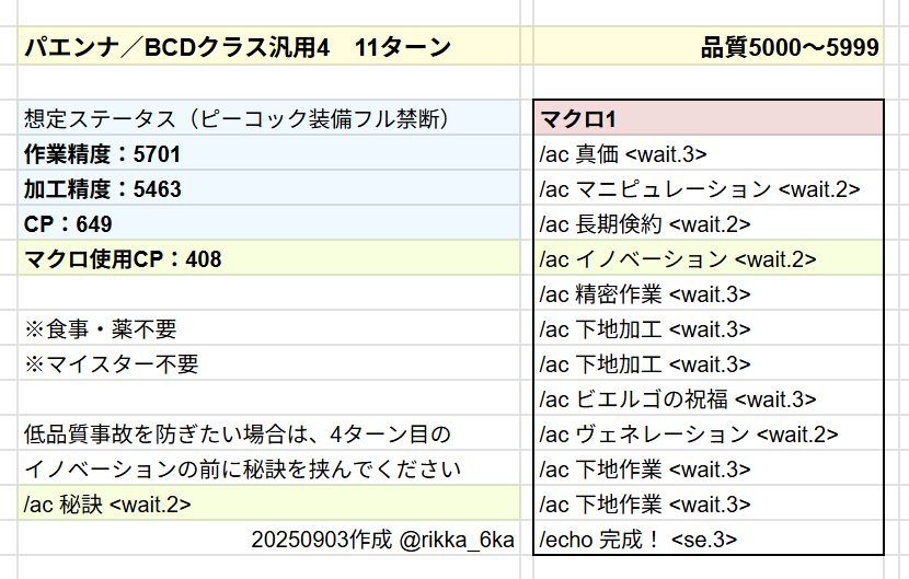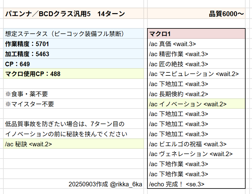 いわゆる低品質事故を軽減したい場合は、7ターンめのイノベーションの前に「/ac 秘訣 <wait.2>」を挟む方法があります。(なくてもさほど影響はありません)