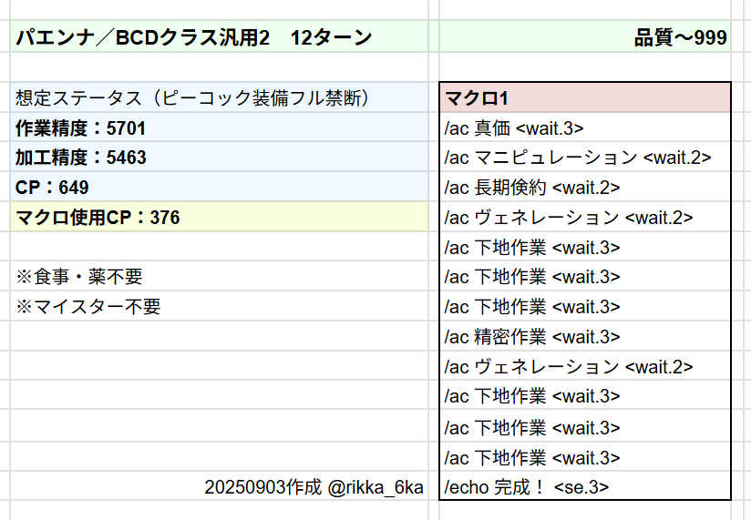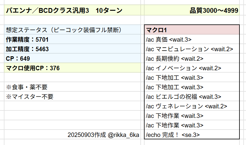 この記事に掲載しているマクロは、クラフタークラスのレベル100、IL750ゴールデンサム/ピーコック装備のフル禁断でのクラフトを想定して作成・動作の検証をしています。