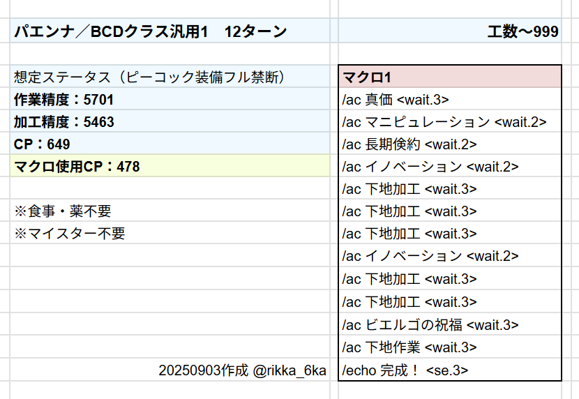 なお、B・C・Dクラス用のマクロは全て食事薬マイスター不要となっています。もちろん(ほかのミッションと並行して進める都合上)食事や薬を使った状態で製作してもかまいません。