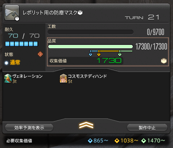 レシピ:耐久70/工数9700/品質17300 収集品 …26ターン