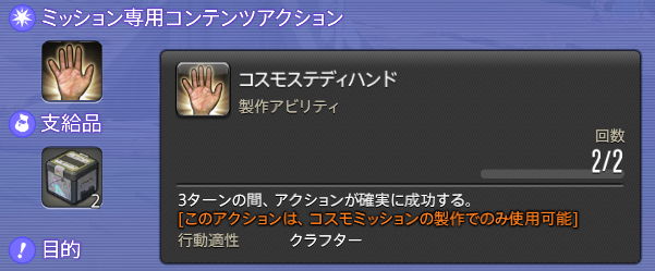 クラフター向けコスモミッションは、一部のレシピ製作時に特別なコンテンツアクションが使えるようになっています。