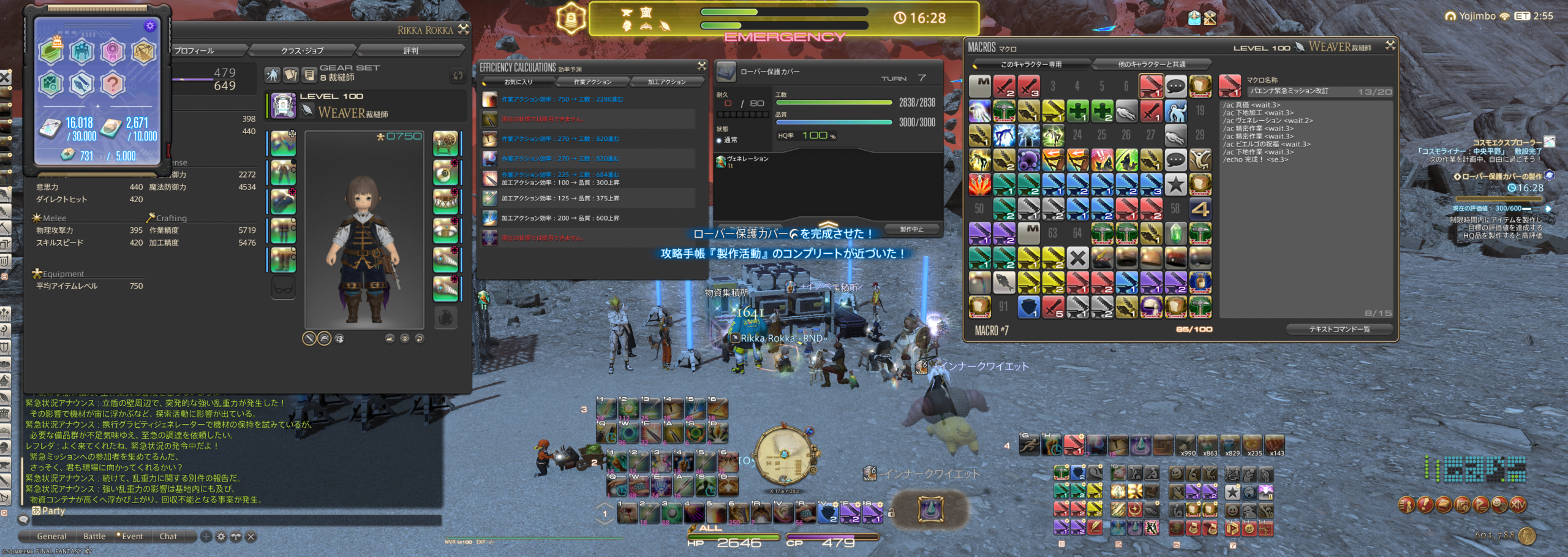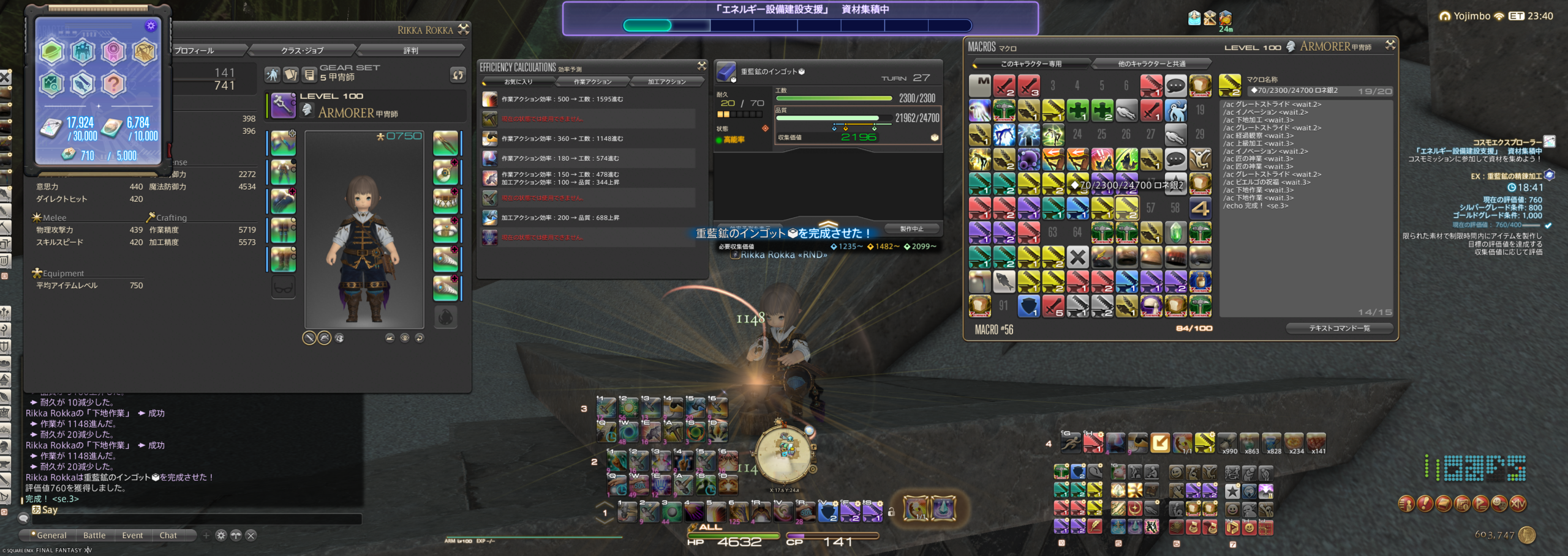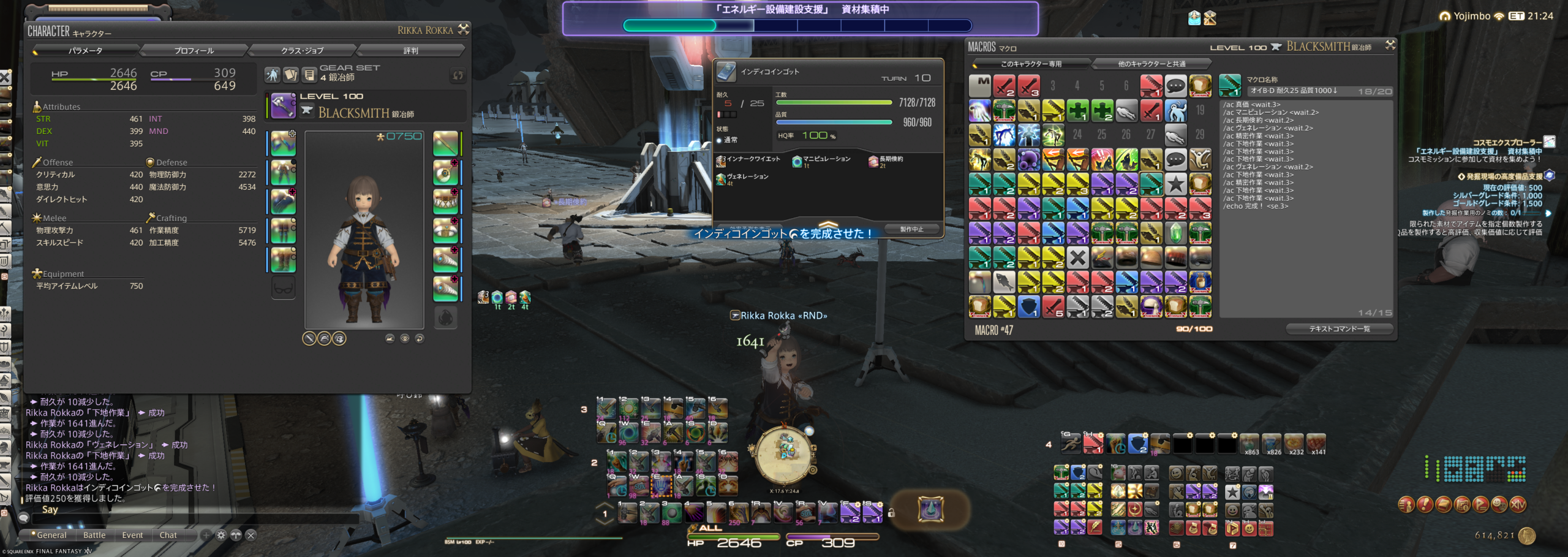 この記事に掲載しているマクロは、クラフタークラスのレベル100、IL750ゴールデンサム/ピーコック装備のフル禁断でのクラフトを想定して作成・動作の検証をしています。