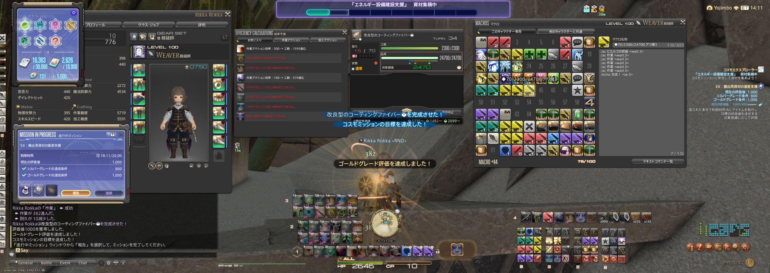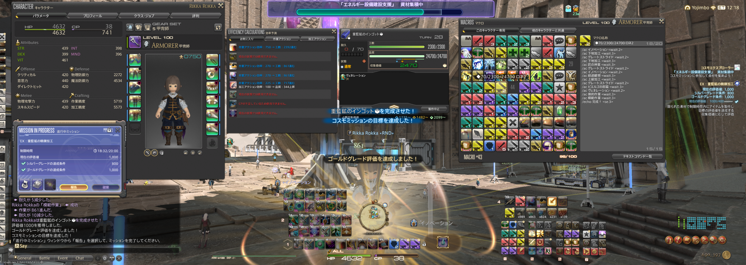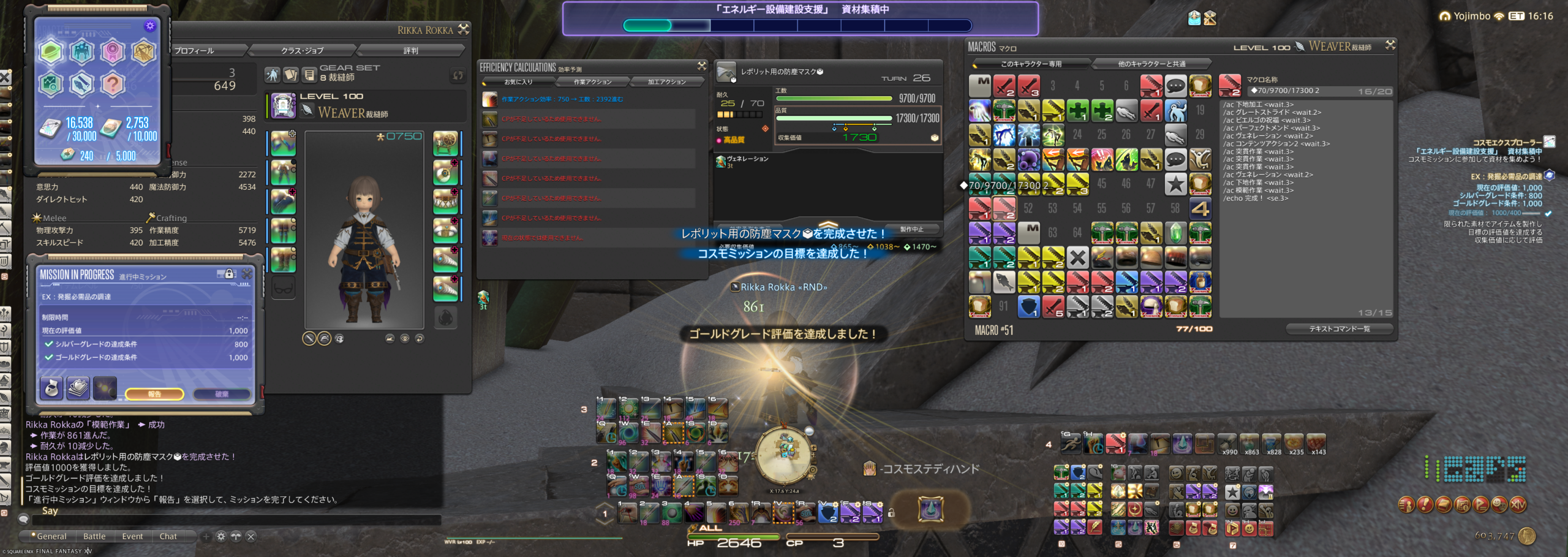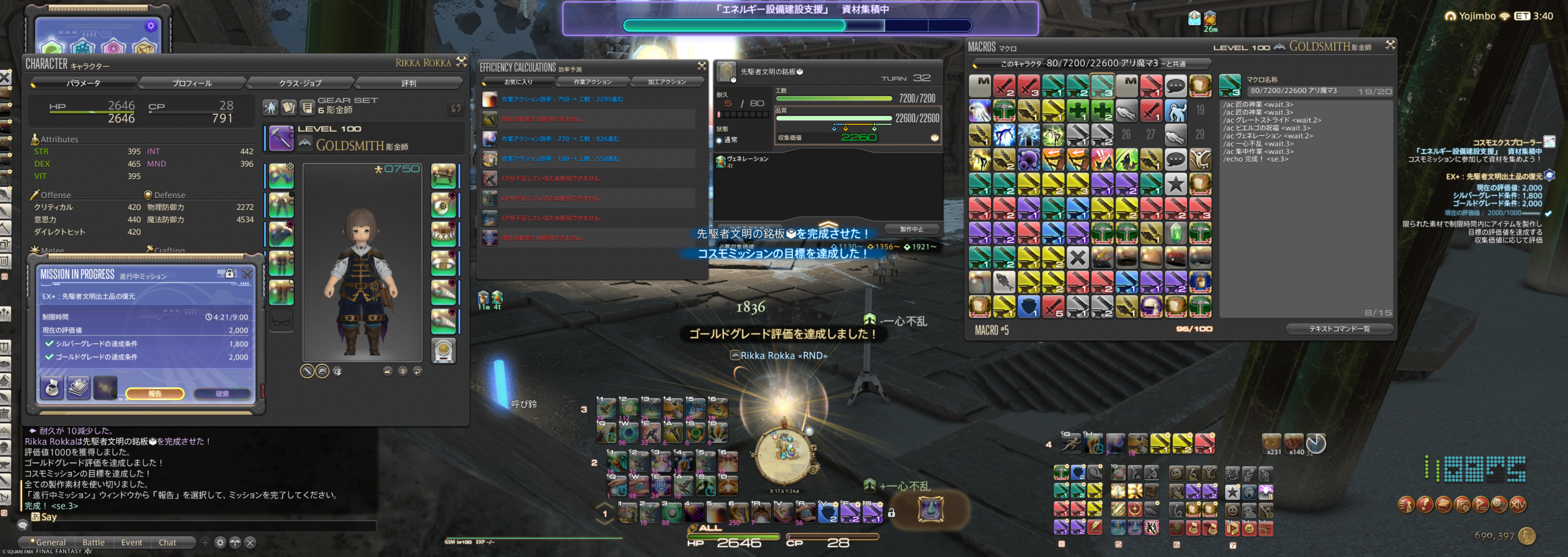 EX+ミッションのレシピはなかなか難しく、マクロでの製作もできる限り試してみていますが、一部は100%ゴールド評価を得られるものにできていない(完成に運要素を含む)のでご注意くださいませ。